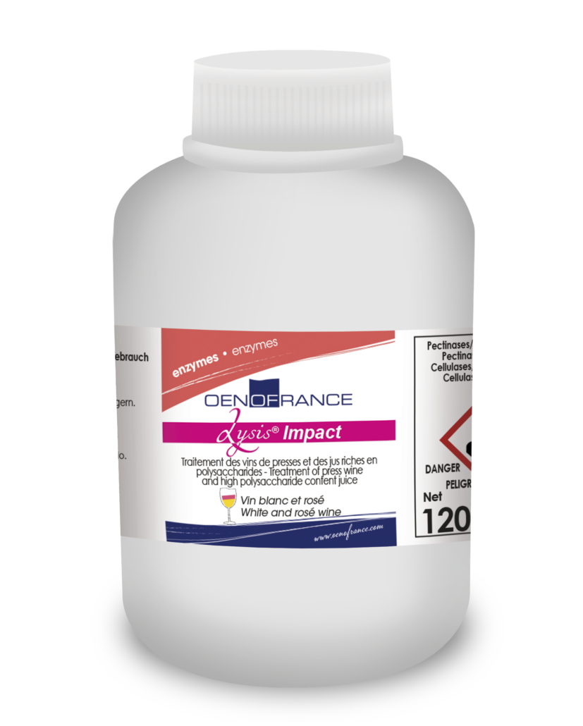 LYSIS® IMPACT ist ein aus Aspergillus niger gewonnenes flüssiges Enzympräparat mit hoher pektolytischer Aktivität. Es enthält Cellulasen und wird zur Verbesserung der Klärung und Filtrierbarkeit von stark feststoffbelasteten Pressmosten eingesetzt.