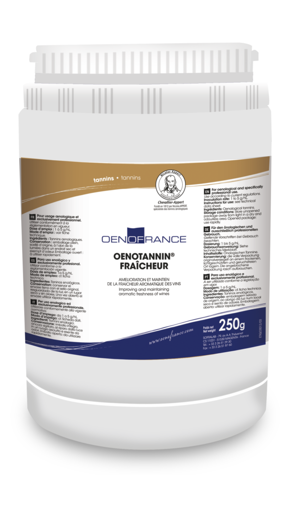 OENOTANNIN FRAÎCHEUR ist ein speziell formulierter Tanninkomplex, der auf die Bedürfnisse der Winzer abgestimmt ist, die moderne weine in aromatischer Hinsicht unterstreichen und verbessern möchten. Seine komplexe Formulierung wirkt auf das Redoxpotenzial der Weine und vermindert so bei Weinen, die aus empfindlichen Rebsorten gekeltert wurden, die Oxidation. OENOTANNIN FRAÎCHEUR kann auch in Jahrgängen verwendet werden, in denen die Weine besonders oxidationsempfindlich sind.
